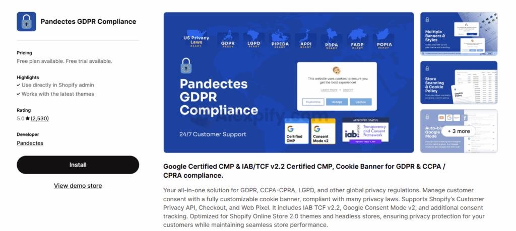 Pricing: Pandectes offers a free plan for basic compliance, with paid tiers at $9, $25, and $35 per month for more advanced features.