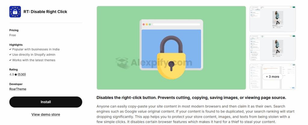 If your store relies heavily on unique product photography or original blog content, protecting your intellectual property is paramount. RT: Disable Right Click is a simple yet effective app designed to prevent unauthorized copying of images and text. It blocks right-click actions, image downloads, and common keyboard shortcuts that bad actors might use to steal your content.
