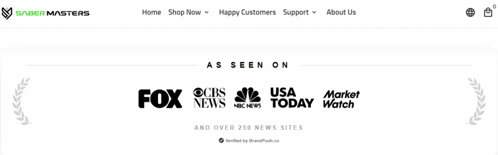 Displaying logos of recognizable companies, especially famous ones, on your store is a powerful visual cue for social proof. While B2B companies often display client logos, dropshipping stores can benefit by showcasing where their products have been featured. Saber Masters, a dropshipping store, effectively uses this tactic.