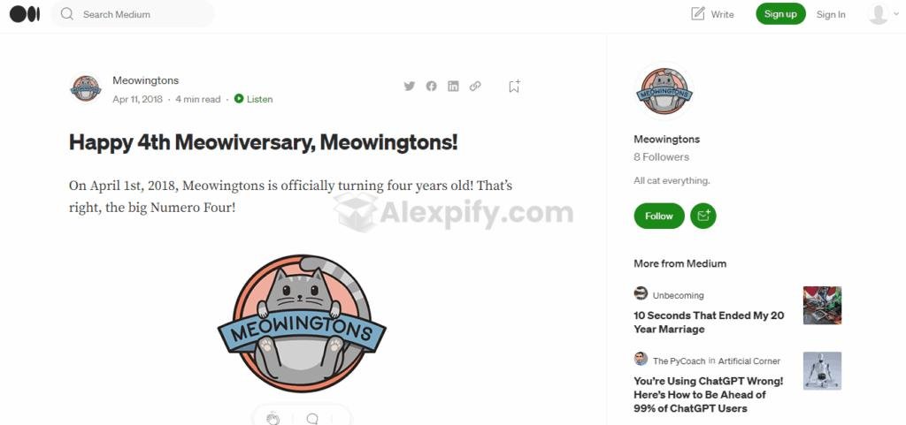 Guest posting involves submitting articles to other websites, which drives additional traffic and builds trust. When potential customers discover your product or store through a respected third-party blog or website, it lends credibility to your business. Meowingtons, for instance, used guest posting on Medium to celebrate an anniversary, reaching a broader audience and gaining visibility.