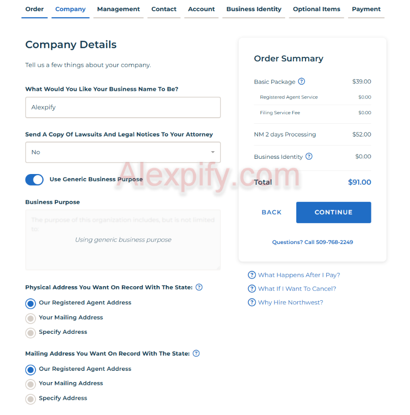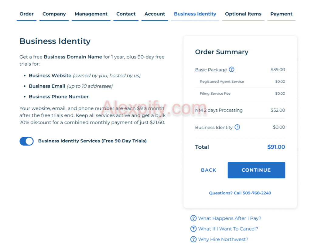 7 - Business Identity : This is the “Business Identity” step of your LLC registration on Northwest Registered Agent. This section is completely optional but can be useful if you want Northwest to help you build your online presence.
