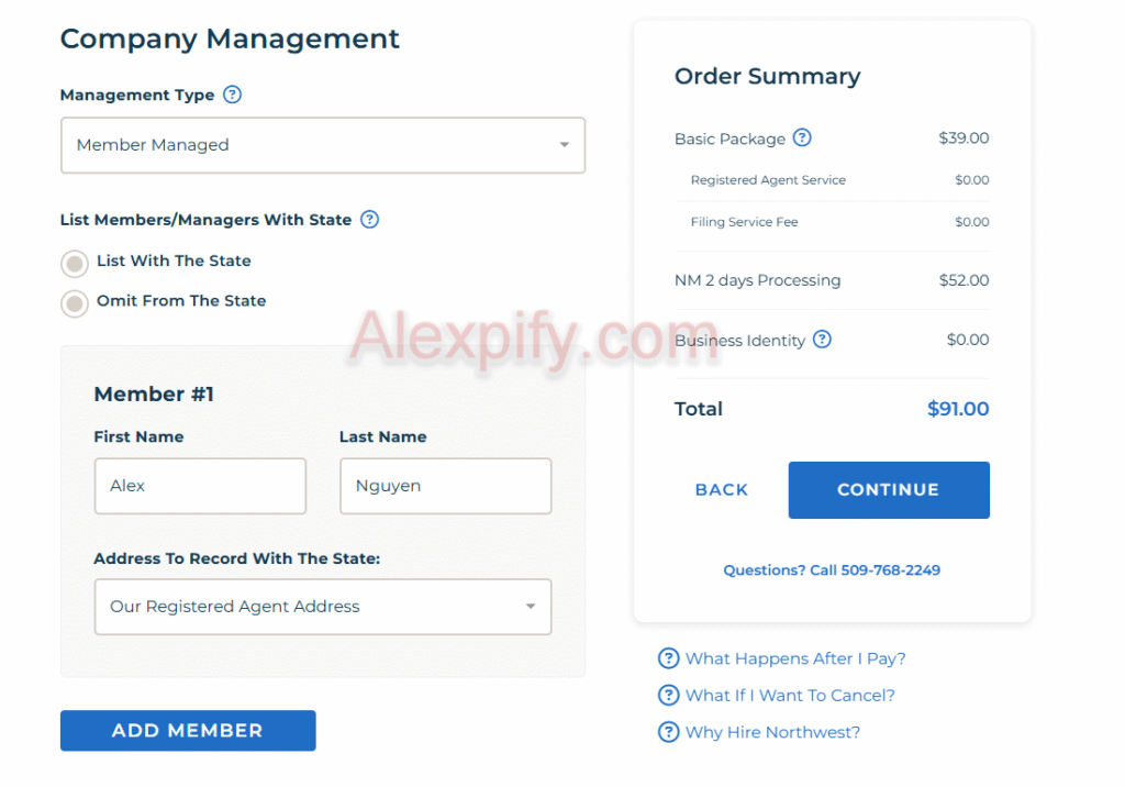 This next screen is the “Company Management” step of your LLC registration with Northwest Registered Agent. This is where you define how your company is managed and who the members or managers are. Let’s go through each field and option carefully: