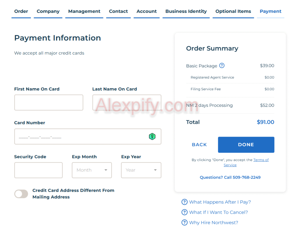 8 - Payment Information: This is the final step of your LLC registration with Northwest Registered Agent, where you complete the payment for your LLC filing.