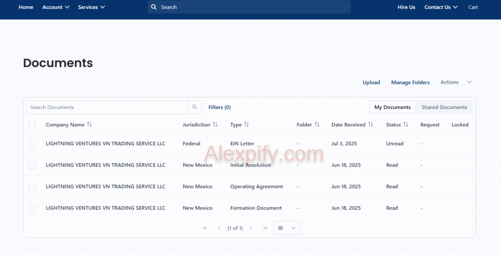 After logging in, you go to Documents and see the results as PDF files containing certificates for your US business.